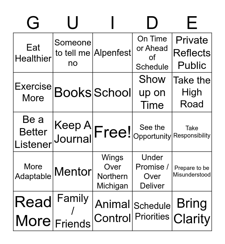 This bingo card has a free space and 29 words: Help Someone Who Can't Help Me, Family / Friends, Alpenfest, Know When to Quit, Private Reflects Public, Eat Healthier, Books, School, See the Opportunity, Prepare to be Misunderstood, Read More, Keep A Journal, Schedule Priorities, Bring Clarity, Be a Better Listener, Boss, Animal Control, Under Promise / Over Deliver, Take the High Road, More Adaptable, Mentor, Fair, Show up on Time, Take Responsibility, Exercise More, Someone to tell me no, Wings Over Northern Michigan, On Time or Ahead of Schedule and Call People By Name.