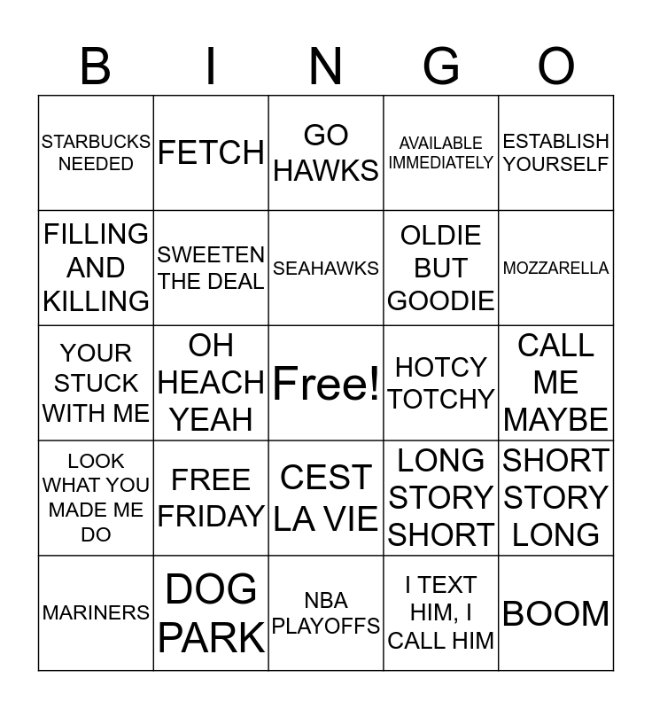 This bingo card has a free space and 24 words: FREE FRIDAY, DOG PARK, SEAHAWKS, MARINERS, ESTABLISH YOURSELF, STARBUCKS NEEDED, FILLING AND KILLING, FETCH, HOTCY TOTCHY, CEST LA VIE, OLDIE BUT GOODIE, YOUR STUCK WITH ME, LONG STORY SHORT, SHORT STORY LONG, SWEETEN THE DEAL, I TEXT HIM, I CALL HIM, CALL ME MAYBE, GO HAWKS, MOZZARELLA, OH HEACH YEAH, BOOM, LOOK WHAT YOU MADE ME DO, AVAILABLE IMMEDIATELY and NBA PLAYOFFS.