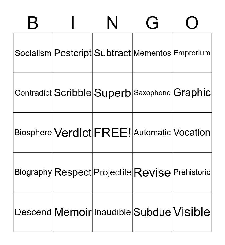 This bingo card has a free space and 24 words: Respect, Memoir, Superb, Descend, Emprorium, Socialism, Contradict, Postcript, Automatic, Projectile, Saxophone, Biosphere, Revise, Prehistoric, Scribble, Subdue, Vocation, Subtract, Graphic, Verdict, Visible, Biography, Mementos and Inaudible.