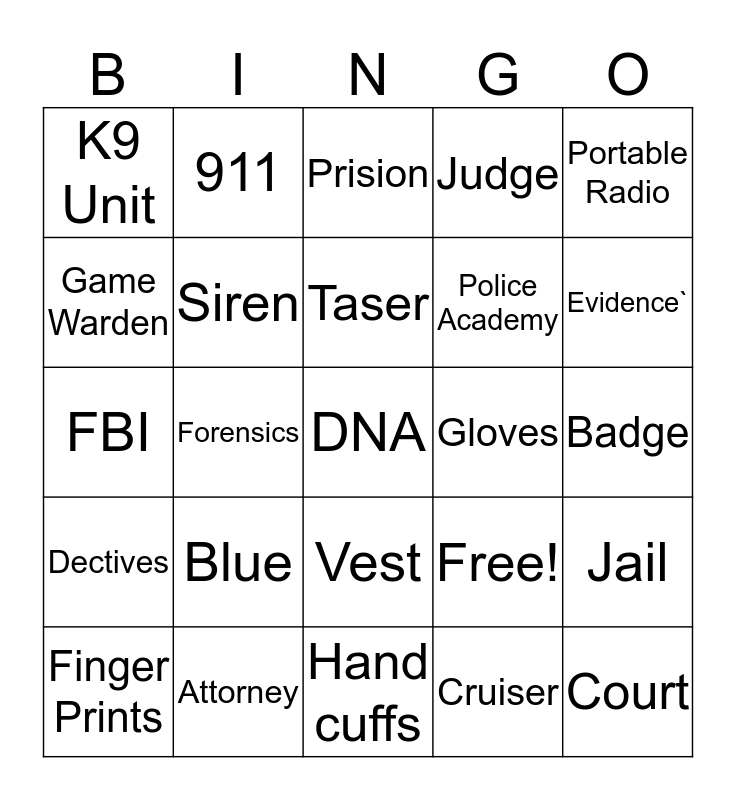 This bingo card has 25 words: Blue, Hand cuffs, Taser, Finger Prints, Portable Radio, K9 Unit, Game Warden, 911, Gloves, Vest, Police Academy, FBI, Free!, Jail, Siren, Court, Badge, Prision, Evidence`, Forensics, DNA, Attorney, Dectives, Judge and Cruiser.