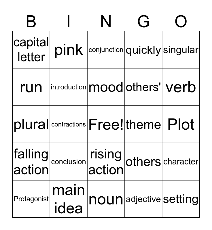 This bingo card has a free space and 29 words: Protagonist, Antagonist, contractions, period, capital letter, conjunction, introduction, conclusion, theme, main idea, Plot, setting, noun, adjective, verb, adverb, rising action, falling action, singular, plural, others, each other's, others', run, quickly, pink, character, mood and Mrs. Bertsch.