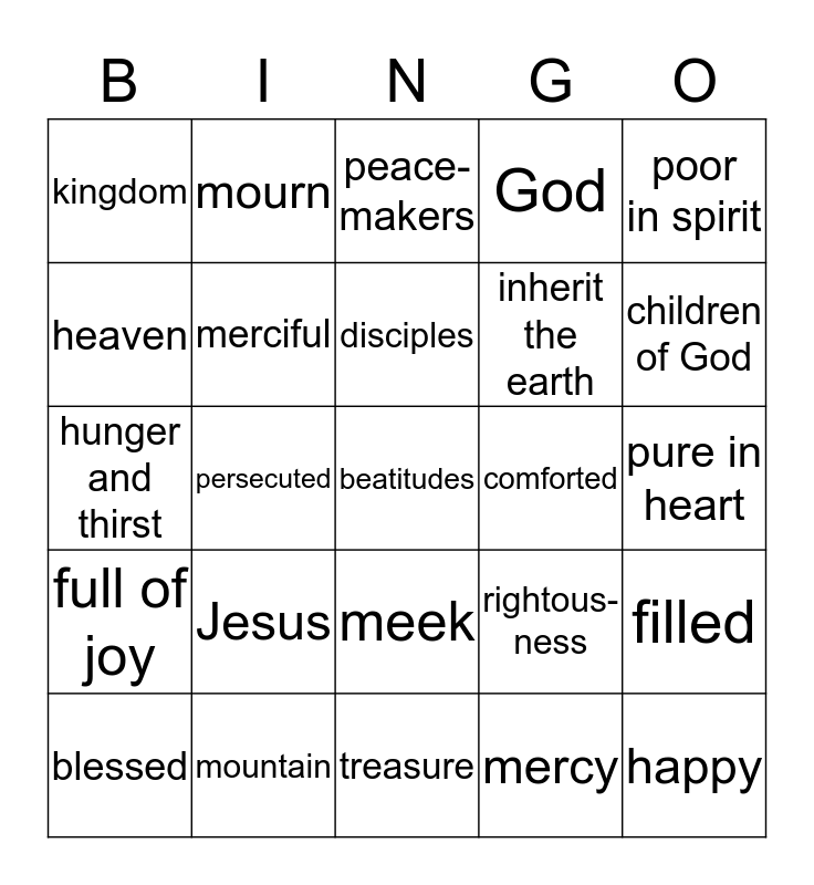 This bingo card has a free space and 24 words: Jesus, mountain, disciples, blessed, poor in spirit, kingdom, heaven, mourn, comforted, meek, inherit the earth, hunger and thirst, rightous-ness, filled, merciful, mercy, pure in heart, peace-makers, children of God, persecuted, happy, full of joy, God and treasure.