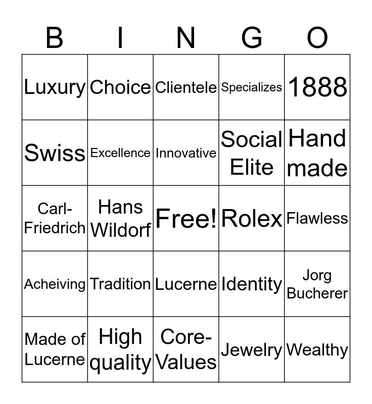 This bingo card has a free space and 34 words: Switzerland, Jewelry, Reputation, Bucherer, Acheiving, Excellence, 1888, Made of Lucerne, Choice, Beauty, Innovative, Clientele, Core-Collection, Partnership, Rolex, Hand made, High quality, Carl-Friedrich, Tradition, Identity, Lucerne, Prestigious, Luxury, Flawless, Core-Values, Wealthy, Specializes, Watches, Social Elite, Swiss, Tourneau LLC, Hans Wildorf, Jorg Bucherer and 125th.