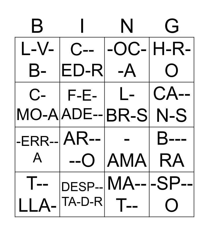 This bingo card has 27 words: SI--O-, CUA--R--, -ERR--A, FL-R-S, F-E-ADE--, -OC--A, C--ED-R, -SP--O, DESP--TA-D-R, -ILL-, -AMA, H-R-O, A--OM--A, -LMO--D-, AR----O, CUC-AR-, L-BR-S, CA--N-S, N-VE--, L-V-B-, MA--T--, PL-NT--, B---RA, T--LLA-, L--PA-A, C-MO-A and ES-ANT---A.