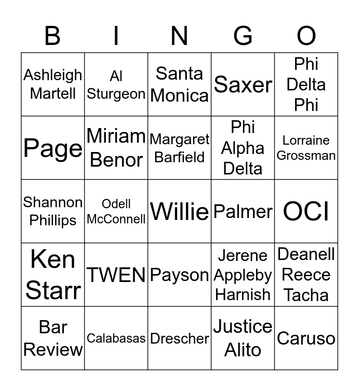 This bingo card has a free space and 24 words: TWEN, Calabasas, Margaret Barfield, Bar Review, Phi Delta Phi, Ashleigh Martell, Page, Al Sturgeon, Palmer, Payson, Phi Alpha Delta, Shannon Phillips, Jerene Appleby Harnish, Deanell Reece Tacha, Miriam Benor, Justice Alito, OCI, Santa Monica, Lorraine Grossman, Odell McConnell, Caruso, Ken Starr, Saxer and Drescher.