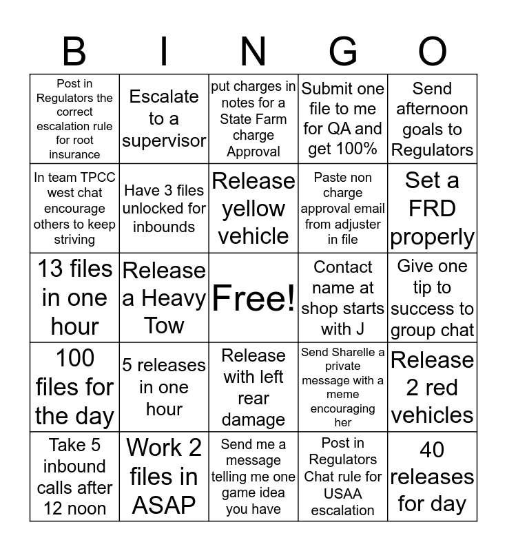 This bingo card has a free space and 24 words: 5 releases in one hour, Work 2 files in ASAP, Release yellow vehicle, Take 5 inbound calls after 12 noon, Send afternoon goals to Regulators, Post in Regulators the correct escalation rule for root insurance, In team TPCC west chat encourage others to keep striving, Escalate to a supervisor, Contact name at shop starts with J, Release with left rear damage, Paste non charge approval email from adjuster in file, 13 files in one hour, Send Sharelle a private message with a meme encouraging her, Release 2 red vehicles, Have 3 files unlocked for inbounds, Post in Regulators Chat rule for USAA escalation, Give one tip to success to group chat, put charges in notes for a State Farm charge Approval, Set a FRD properly, Release a Heavy Tow, 40 releases for day, 100 files for the day, Submit one file to me for QA and get 100% and Send me a message telling me one game idea you have.