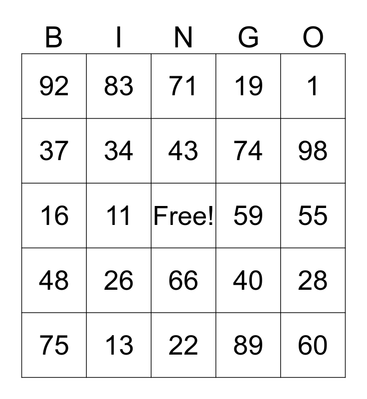 This bingo card has a free space and 24 words: 26, 13, 43, 75, 1, 92, 37, 83, 59, 66, 74, 16, 40, 28, 34, 89, 55, 71, 98, 11, 60, 48, 19 and 22.