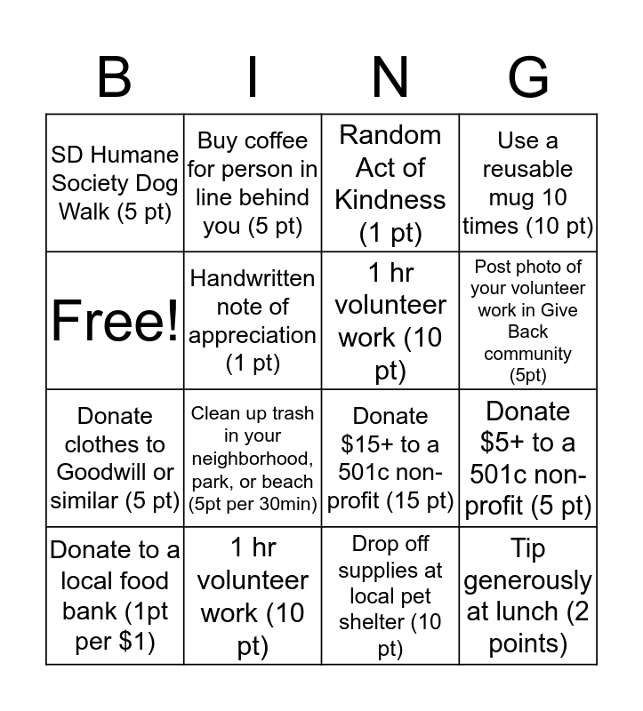 This bingo card has 16 words: 1 hr volunteer work (10 pt), Donate $5+ to a 501c non-profit (5 pt), Random Act of Kindness (1 pt), SD Humane Society Dog Walk (5 pt), Donate clothes to Goodwill or similar (5 pt), Buy coffee for person in line behind you (5 pt), Donate $15+ to a 501c non-profit (15 pt), Drop off supplies at local pet shelter (10 pt), Free!, Handwritten note of appreciation (1 pt), Donate to a local food bank (1pt per $1), Use a reusable mug 10 times (10 pt), Clean up trash in your neighborhood, park, or beach (5pt per 30min), Post photo of your volunteer work in Give Back community (5pt), 1 hr volunteer work (10 pt) and Tip generously at lunch (2 points).