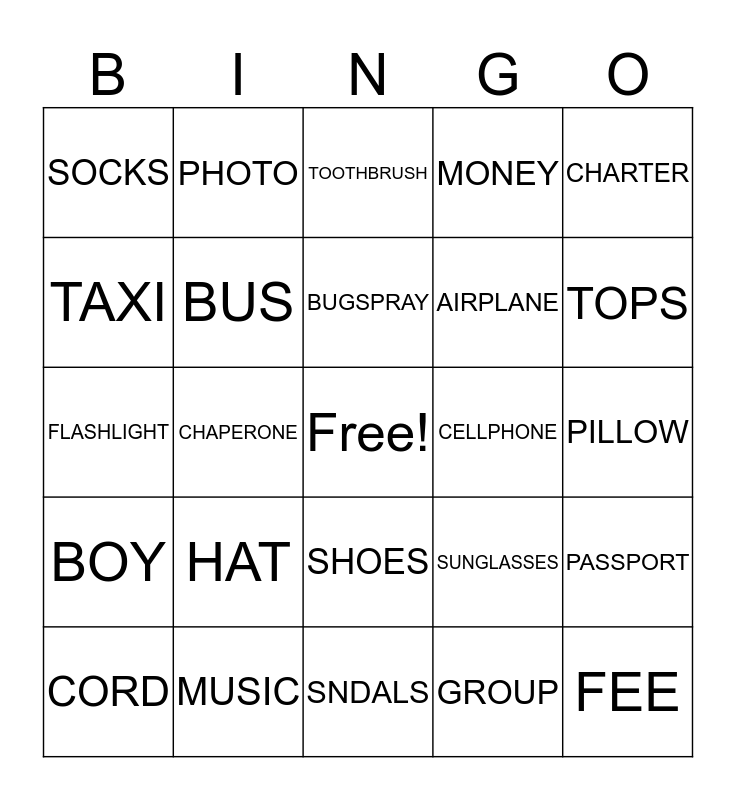 This bingo card has a free space and 32 words: GROUP, TEACHER, CHAPERONE, GIRL, BOY, BUS, CHARTER, PASSPORT, PHOTO, CAMERA, BUGSPRAY, TOOTHBRUSH, TOOTHPASTE, DEODORANT, CELLPHONE, CHARGER, CORD, FLASHLIGHT, SHOES, HAT, SUNGLASSES, BACKPACK, PILLOW, MUSIC, FEE, MONEY, AIRPLANE, TAXI, SOCKS, SNDALS, SHORTS and TOPS.