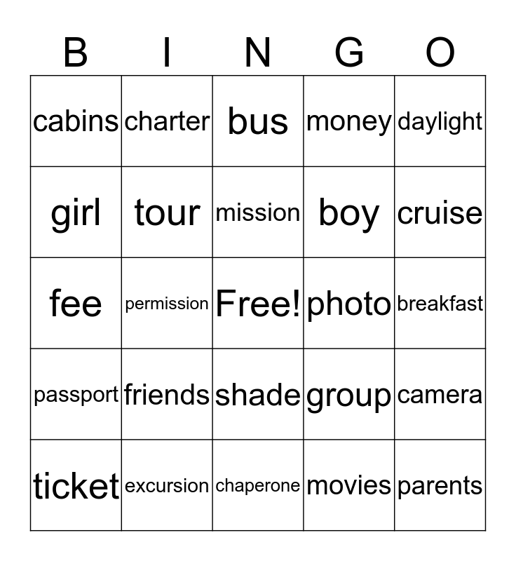 This bingo card has a free space and 27 words: group, teacher, boy, chaperone, girl, bus, charter, passport, photo, camera, fee, money, ticket, excursion, cruise, hospital, tour, mission, friends, cabins, breakfast, movies, permission, parents, shade, daylight and park.