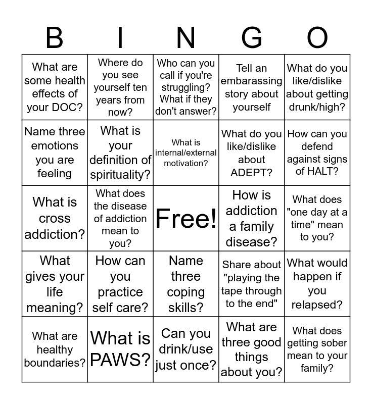 This bingo card has a free space and 29 words: What are healthy boundaries?, What are three triggers for you?, What does the disease of addiction mean to you?, Use the ABC method to challenge a negative thought., What are some health effects of your DOC?, Who can you call if you're struggling? What if they don't answer?, What is your definition of spirituality?, How can you practice self care?, How is addiction a family disease?, What is PAWS?, What does "one day at a time" mean to you?, What does getting sober mean to your family?, Can you drink/use just once?, What are three good things about you?, How can you defend against signs of HALT?, Name 5 things you are grateful for, Name three coping skills?, What gives your life meaning?, What do you like/dislike about getting drunk/high?, What is cross addiction?, Share about "playing the tape through to the end", What do you like/dislike about meetings?, What do you like/dislike about ADEPT?, Name three emotions you are feeling, Tell an embarassing story about yourself, Where do you see yourself ten years from now?, What would happen if you relapsed?, What is internal/external motivation? and As a child, what did you want to be when you grew up?.