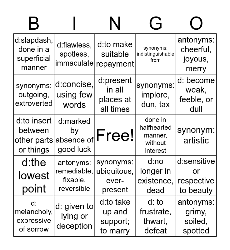 This bingo card has a free space and 29 words: d: melancholy, expressive of sorrow, synonyms: nonplus, foil, d:marked by absence of good luck, d:living together in a group; sociable, d:slapdash, done in a superficial manner, d:to make suitable repayment, d:concise, using few words, antonyms: remediable, fixable, reversible, done in halfhearted manner, without interest, d: given to lying or deception, synonym: artistic, antonyms: grimy, soiled, spotted, d:to take up and support; to marry, d: to frustrate, thwart, defeat, d: become weak, feeble, or dull, d:to trouble with demands, synonyms: ubiquitous, ever-present, d:the lowest point, antonyms: cheerful, joyous, merry, d:to insert between other parts or things, d:no longer in existence, dead, d:equivalent, having the same value, synonyms: implore, dun, tax, synonyms: outgoing, extroverted, synonyms: indistinguishable from, d:flawless, spotless, immaculate, d:sensitive or respective to beauty, d:present in all places at all times and synonyms: embrace, wed.