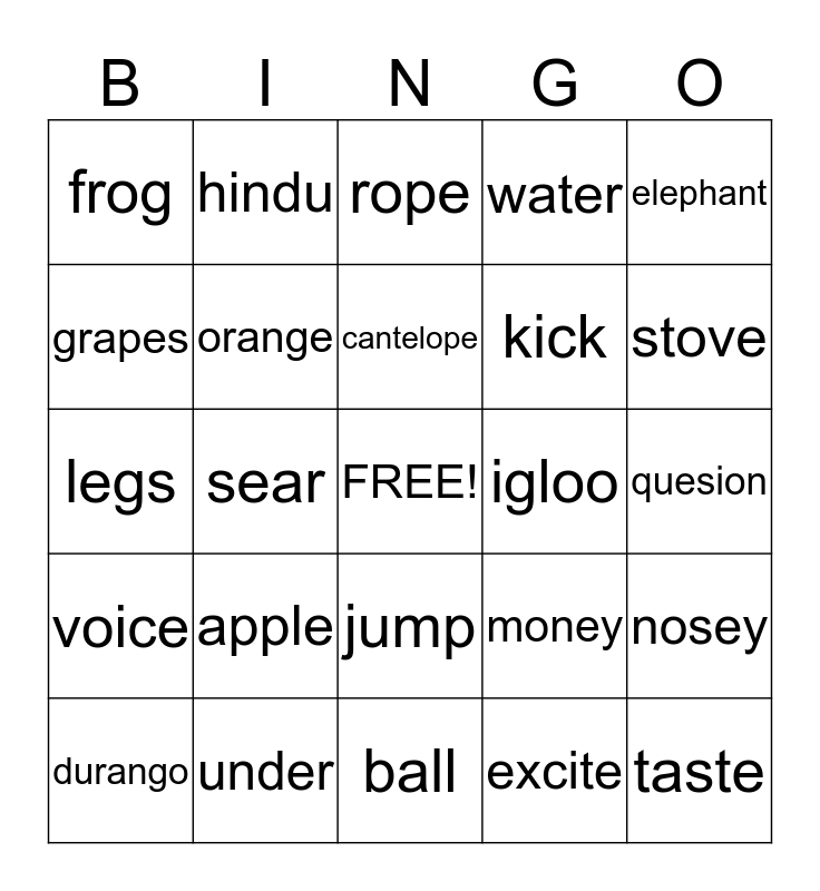 This bingo card has a free space and 25 words: apple, ball, cantelope, durango, elephant, frog, grapes, hindu, igloo, jump, kick, legs, money, nosey, orange, pizza, quesion, rope, stove, sear, taste, under, voice, water and excite.