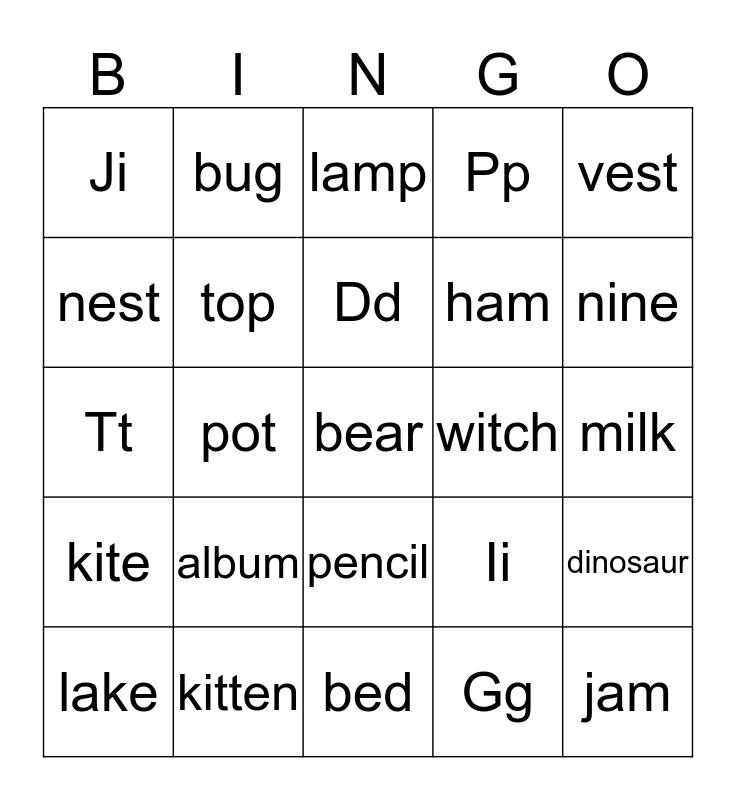 This bingo card has 35 words: cat, tiger, Aa, top, pencil, Pp, nest, nuts, Dd, Sleep, Tt, vest, Bb, yellow, Ji, witch, Gg, pot, kite, bear, Ii, lake, dinosaur, kitten, lamp, nine, jam, monkey, ham, milk, bird, bed, album, bug and jump.