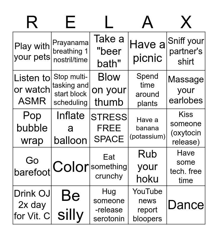 This bingo card has a free space and 29 words: Drink OJ 2x day for Vit. C, Chew gum, Inflate a balloon, Laugh more, Play with your pets, Take a "beer bath", Stop multi-tasking and start block scheduling, Color, Have a banana (potassium), Be silly, Kiss someone (oxytocin release), Dance, Hug someone -release serotonin, YouTube news report bloopers, Massage your earlobes, Use swear words, Eat something crunchy, Go barefoot, Sniff your partner's shirt, Pop bubble wrap, Rub your hoku, Look at fractals, Spend time around plants, Listen to or watch ASMR, Have a picnic, Prayanama breathing 1 nostril/time, Have some tech. free time, Blow on your thumb and Take a long bath or hot shower.