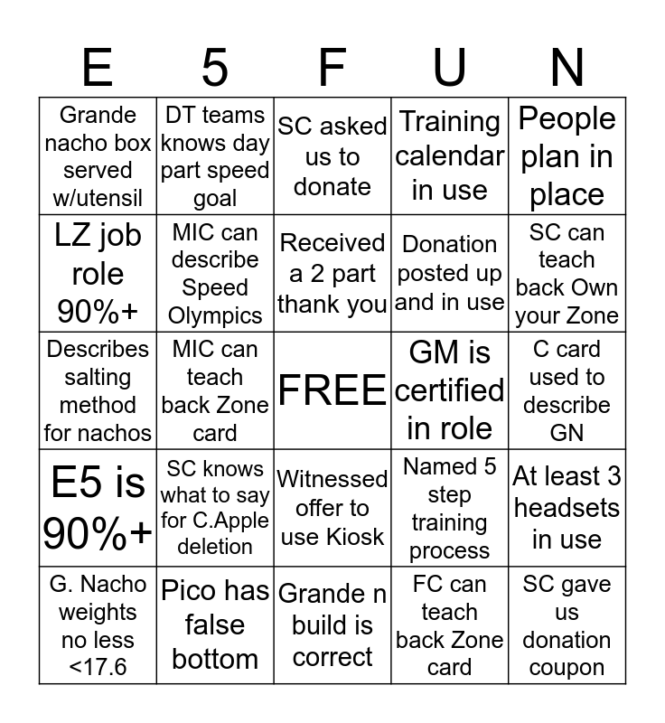 This bingo card has a free space and 24 words: SC knows what to say for C.Apple deletion, Pico has false bottom, Received a 2 part thank you, G. Nacho weights no less <17.6, People plan in place, Grande nacho box served w/utensil, LZ job role 90%+, DT teams knows day part speed goal, GM is certified in role, Witnessed offer to use Kiosk, Donation posted up and in use, Describes salting method for nachos, Named 5 step training process, At least 3 headsets in use, MIC can describe Speed Olympics, FC can teach back Zone card, C card used to describe GN, SC asked us to donate, SC can teach back Own your Zone, MIC can teach back Zone card, SC gave us donation coupon, E5 is 90%+, Training calendar in use and Grande n build is correct.