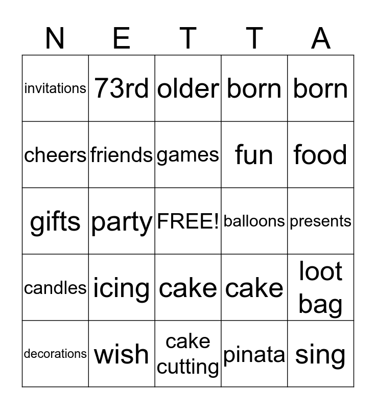 This bingo card has a free space and 24 words: icing, wish, games, decorations, born, invitations, cheers, 73rd, balloons, cake, fun, gifts, cake, loot bag, friends, pinata, presents, older, food, party, sing, candles, born and cake cutting.