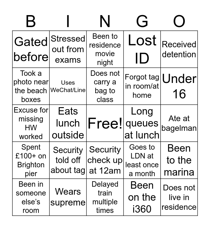 This bingo card has a free space and 24 words: Security told off about tag, Wears supreme, Does not carry a bag to class, Been in someone else’s room, Received detention, Gated before, Took a photo near the beach boxes, Stressed out from exams, Long queues at lunch, Security check up at 12am, Forgot tag in room/at home, Excuse for missing HW worked, Goes to LDN at least once a month, Been to the marina, Uses WeChat/Line, Been on the i360, Ate at bagelman, Been to residence movie night, Under 16, Eats lunch outside, Does not live in residence, Spent £100+ on Brighton pier, Lost ID and Delayed train multiple times.