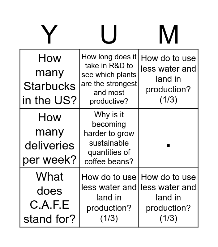 This bingo card has a free space and 13 words: About how many months do coffee cherries take to ripen?, How to grow coffee more sustainably?, What does C.A.F.E stand for?, How long does it take in R&D to see which plants are the strongest and most productive?, How many deliveries per week?, How do to use less water and land in production? (1/3), True or False. C.A.F.E has zero tolerance for deforestation., True or False. Starbucks is an equal opportunity employer, How do to use less water and land in production? (1/3), How many Starbucks in the US?, ., How do to use less water and land in production? (1/3) and How much do employees in retail make an hour?.