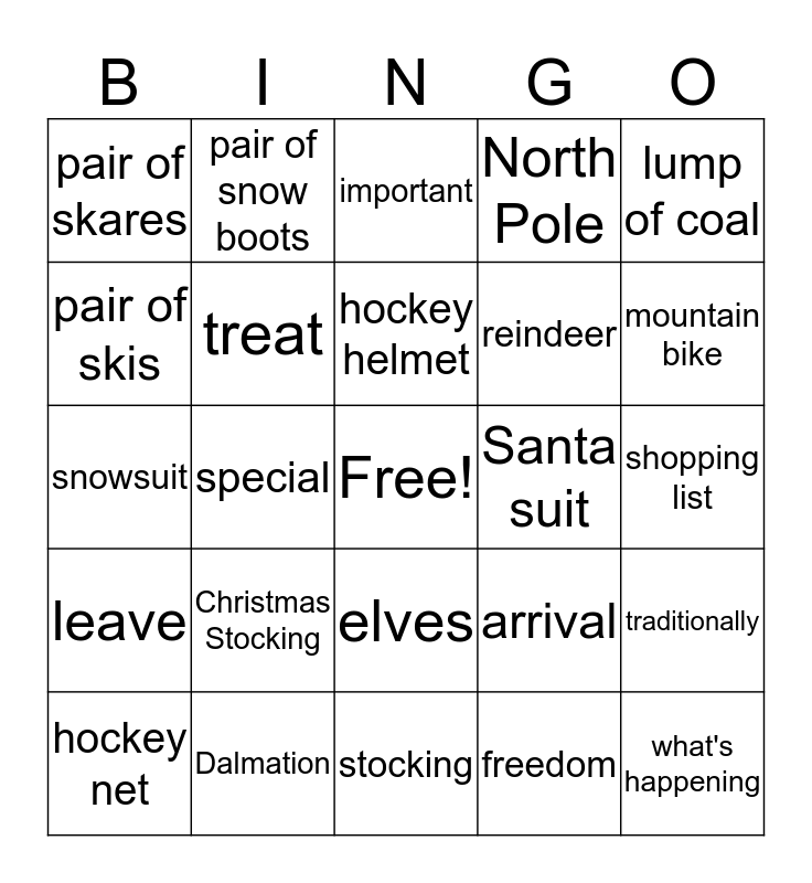 This bingo card has a free space and 24 words: Christmas Stocking, Dalmation, hockey helmet, hockey net, lump of coal, pair of skares, pair of skis, pair of snow boots, Santa suit, elves, reindeer, snowsuit, arrival, traditionally, treat, freedom, shopping list, important, mountain bike, special, what's happening, leave, North Pole and stocking.