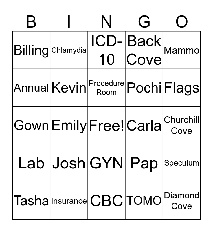 This bingo card has a free space and 39 words: OB, Jen, Barb, Kevin, Tasha, GYN, Procedure Room, Ultrasound, Mammo, Lab, Emily, Back Cove, Diamond Cove, Churchill Cove, Carla, Josh, Erin, Billing, Medical Secretary, Pap, Annual, CBC, Pochi, Flags, Buckets, TouchPoint, Greenway, Patient, New Patient, Chlamydia, BPP, UA, ICD-10, Insurance, TOMO, Laminator, Speculum, Gown and Drape.