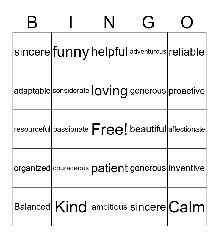 This bingo card has a free space and 24 words: courageous, Kind, loving, Balanced, reliable, sincere, adaptable, funny, beautiful, patient, generous, resourceful, generous, inventive, considerate, sincere, affectionate, helpful, proactive, passionate, Calm, organized, adventurous and ambitious.