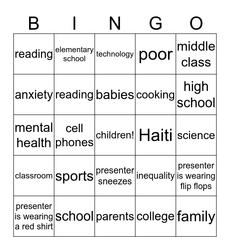 This bingo card has a free space and 24 words: presenter is wearing a red shirt, sports, babies, college, middle class, reading, elementary school, technology, Haiti, science, mental health, reading, inequality, presenter is wearing flip flops, anxiety, school, parents, poor, high school, classroom, cell phones, presenter sneezes, cooking and family.