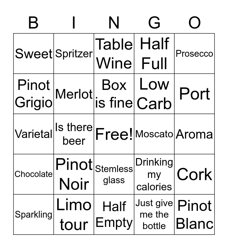 This bingo card has 1 images, a free space and 49 words: Tipsy, Pinot Blanc, Vintage, Half Empty, Pinot Noir, Chardonnay, Spritzer, Lush, Pinot Grigio, Shiraz, Merlot, Half Full, Cork, Drinking my calories, Champagne, Blush, Box is fine, Moscato, Dry, Prosecco, Is there beer, Just give me the bottle, Sweet, Low Carb, Cheese, Port, Sparkling, Dessert, Stemless glass, Chocolate, Tasting party, Barrel, Rose, Zinfandel, Limo tour, Toast, Tannin, Bouquet, Aroma, Chablis, Breathe, Ice Wine, Chianti, Oak, Varietal, Table Wine, Reserve, Cellar and Table Wine.