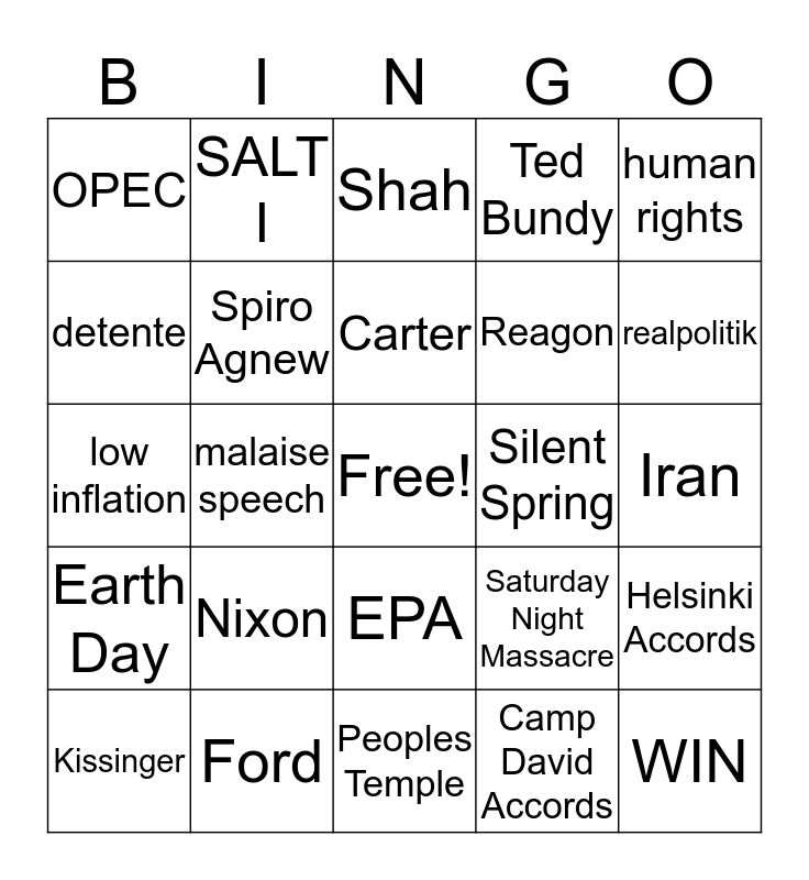This bingo card has a free space and 24 words: Nixon, Ford, Carter, Kissinger, human rights, OPEC, detente, SALT I, Silent Spring, EPA, Reagon, low inflation, Saturday Night Massacre, Helsinki Accords, Spiro Agnew, Camp David Accords, Iran, Shah, realpolitik, malaise speech, WIN, Earth Day, Ted Bundy and Peoples Temple.