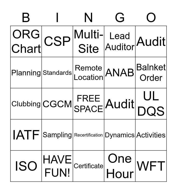 This bingo card has a free space and 24 words: Sampling, HAVE FUN!, Remote Location, ISO, Audit, ORG Chart, Planning, CSP, Audit, Recertification, ANAB, Clubbing, Dynamics, Activities, Standards, One Hour, UL DQS, Multi- Site, Balnket Order, CGCM, WFT, IATF, Lead Auditor and Certificate.