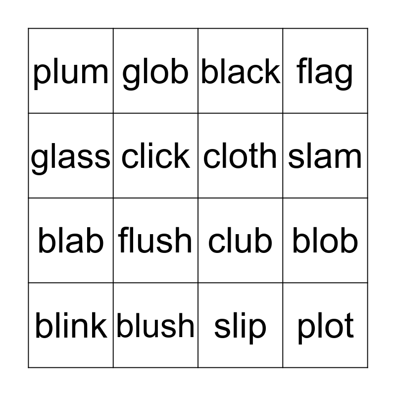 This bingo card has 28 words: sled, slop, slip, glad, glass, glob, black, blob, blab, blush, flip, flag, fluff, class, clap, cliff, clock, click, club, plot, plum, plod, plan, slam, blink, flush, cloth and slug.