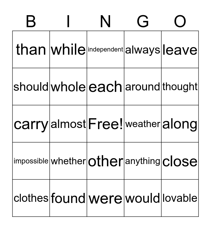 This bingo card has a free space and 26 words: other, would, each, found, leave, than, should, while, along, anything, around, carry, close, clothes, almost, also, always, impossible, independent, lovable, thought, were, weather, whether, whole and hole.