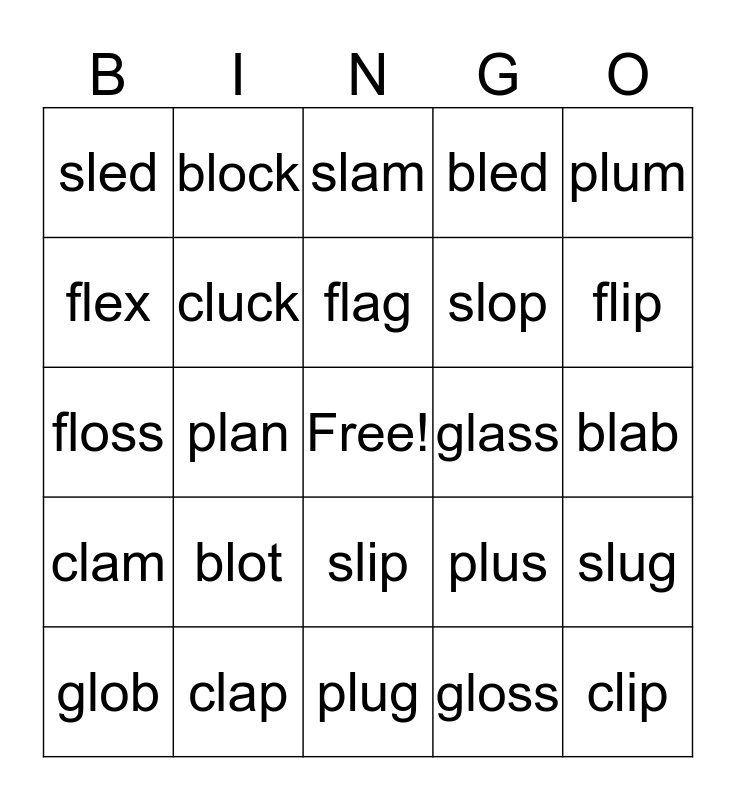 This bingo card has a free space and 24 words: blot, clap, flag, glob, plum, sled, flex, block, glass, slip, slop, floss, plus, slug, cluck, gloss, blab, slam, flip, plan, clip, clam, bled and plug.