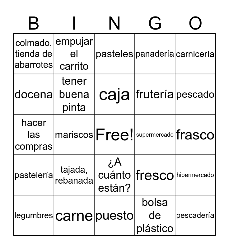 This bingo card has a free space and 26 words: ¿A cuánto están?, bolsa de plástico, caja, carne, carnicería, colmado, tienda de abarrotes, docena, empujar el carrito, frasco, fresco, frutería, hacer las compras, hipermercado, legumbres, mariscos, pan, panadería, pastelería, pasteles, pescadería, pescado, puesto, supermercado, tajada, rebanada, tener buena pinta and verdulería.