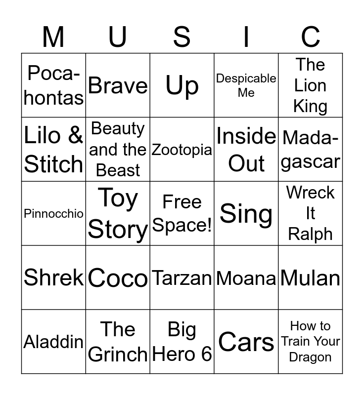 This bingo card has a free space and 33 words: The Little Mermaid, Frozen, Toy Story, The Lego Movie, Shrek, Beauty and the Beast, The Lion King, Aladdin, Brave, Monsters Inc., Zootopia, Up, Ice Age, Finding Nemo, Sing, Mada-gascar, The Grinch, Pinnocchio, Coco, Moana, Tarzan, The Jungle Book, Poca-hontas, Wreck It Ralph, Big Hero 6, How to Train Your Dragon, Despicable Me, Inside Out, Lilo & Stitch, Mulan, Ratatoulle, Cars and Tangled.