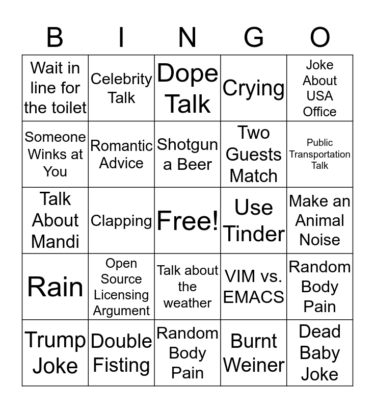 This bingo card has a free space and 34 words: Hawaiian Shirt, Burnt Weiner, See Henri Family Member, Wine Drunk, Rain, Romantic Advice, Joke About USA Office, Trump Joke, Celebrity Talk, Zipper Down, Shotgun a Beer, Dope Talk, GoT Chit Chat, Awkward Silence, Use Tinder, Public Transportation Talk, Double Fisting, Talk About Mandi, Open Source Licensing Argument, VIM vs. EMACS, Talk about the weather, Unwanted physical contact, Wait in line for the toilet, Make an Animal Noise, Random Body Pain, Dead Baby Joke, Crying, Big Announcement Made, Two Guests Match, Someone Winks at You, Handshake, Clapping, Random Body Pain and Online Shopping.