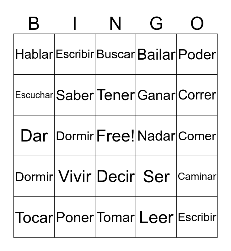 This bingo card has a free space and 29 words: Ver, Poner, Buscar, Decir, Poder, Hablar, Saber, Tener, Nadar, Caminar, Tocar, Dormir, Leer, Escribir, Dar, Hacer, Tomar, Ser, Correr, Dormir, Vivir, Ir, Ganar, Comer, Escuchar, Escribir, Decir, Bailar and Beber.