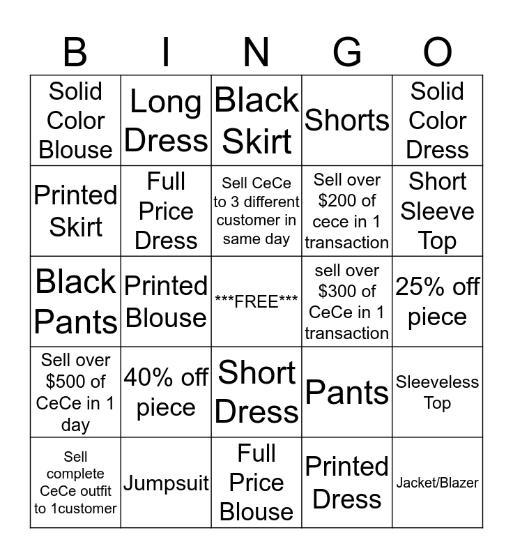This bingo card has a free space and 24 words: 40% off piece, Jumpsuit, Sell CeCe to 3 different customer in same day, Sell complete CeCe outfit to 1customer, Solid Color Dress, Solid Color Blouse, Printed Skirt, Long Dress, sell over $300 of CeCe in 1 transaction, Short Dress, Sell over $200 of cece in 1 transaction, Black Pants, Pants, Sleeveless Top, Full Price Dress, Printed Dress, 25% off piece, Black Skirt, Short Sleeve Top, Printed Blouse, Jacket/Blazer, Sell over $500 of CeCe in 1 day, Shorts and Full Price Blouse.