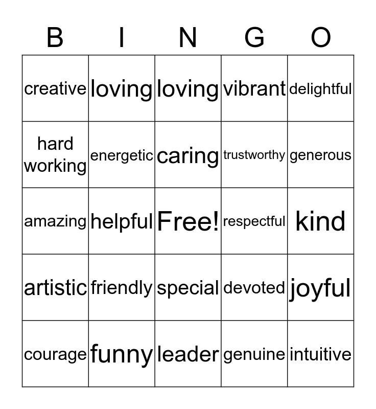 This bingo card has a free space and 24 words: friendly, funny, caring, courage, delightful, creative, hard working, loving, respectful, special, trustworthy, amazing, devoted, joyful, energetic, genuine, kind, loving, generous, helpful, intuitive, artistic, vibrant and leader.