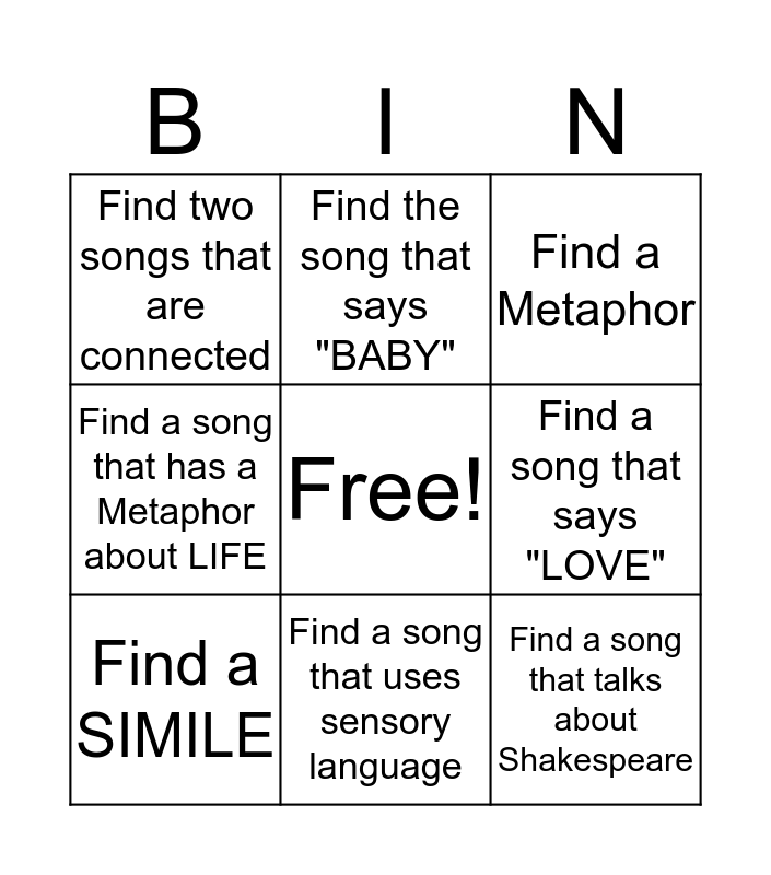 This bingo card has a free space and 8 words: Find a song that says "LOVE", Find a Metaphor, Find the song that says "BABY", Find a SIMILE, Find two songs that are connected, Find a song that talks about Shakespeare, Find a song that has a Metaphor about LIFE and Find a song that uses sensory language.