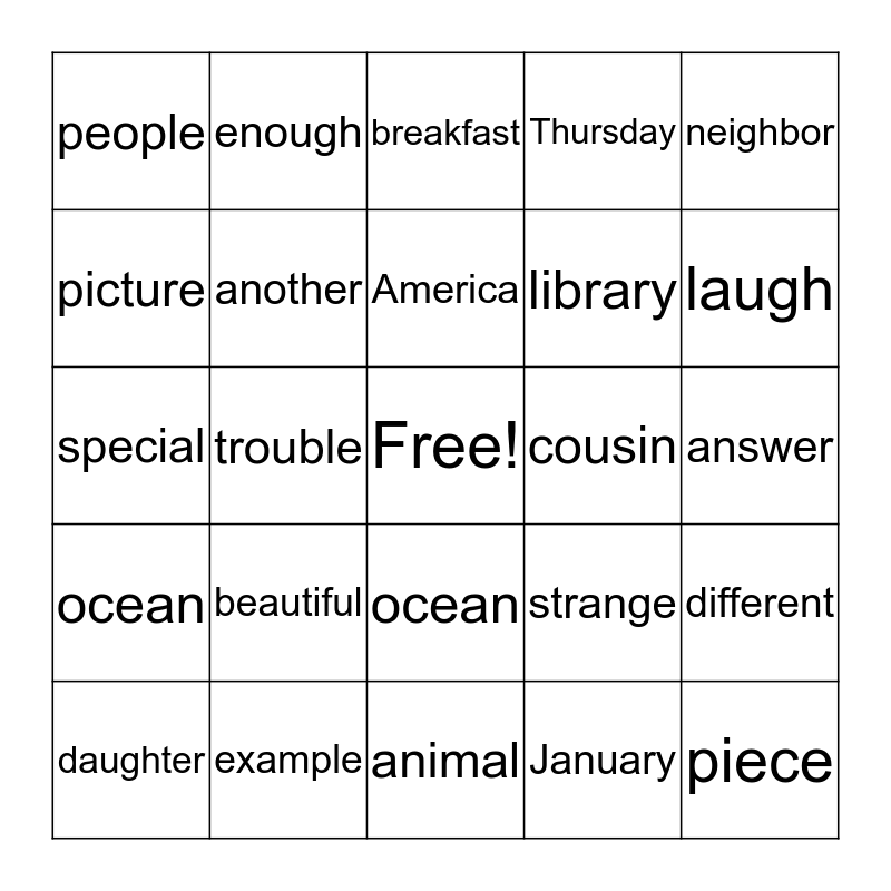 This bingo card has a free space and 24 words: beautiful, example, America, daughter, neighbor, people, picture, enough, cousin, ocean, library, special, strange, different, another, January, answer, breakfast, laugh, trouble, piece, ocean, Thursday and animal.