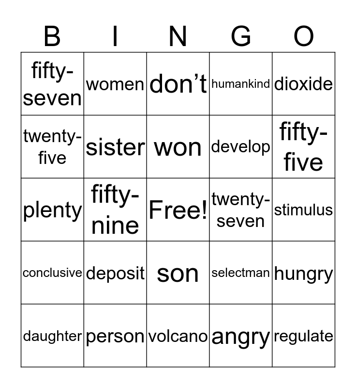 This bingo card has a free space and 39 words: mother, father, brother, sister, daughter, son, won, ton, dioxide, conclusive, fifty-nine, humankind, regulate, stimulus, twenty-seven, deposit, educate, fifty-seven, industry, selectman, twenty-five, volcano, develop, fifty-five, fifty-six, populate, stimuli, twenty-nine, woman, women, beautiful, pretty, don’t, person, angry, empty, hungry, plenty and twenty.