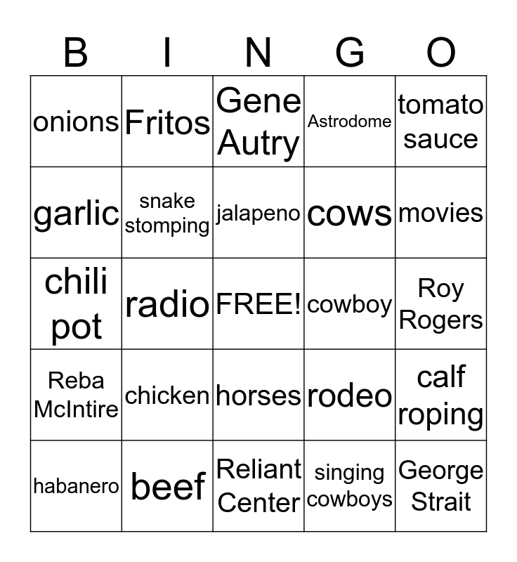 This bingo card has a free space and 24 words: chicken, beef, jalapeno, habanero, tomato sauce, onions, garlic, Fritos, cowboy, horses, cows, chili pot, rodeo, calf roping, snake stomping, singing cowboys, Roy Rogers, Gene Autry, movies, radio, George Strait, Reba McIntire, Astrodome and Reliant Center.