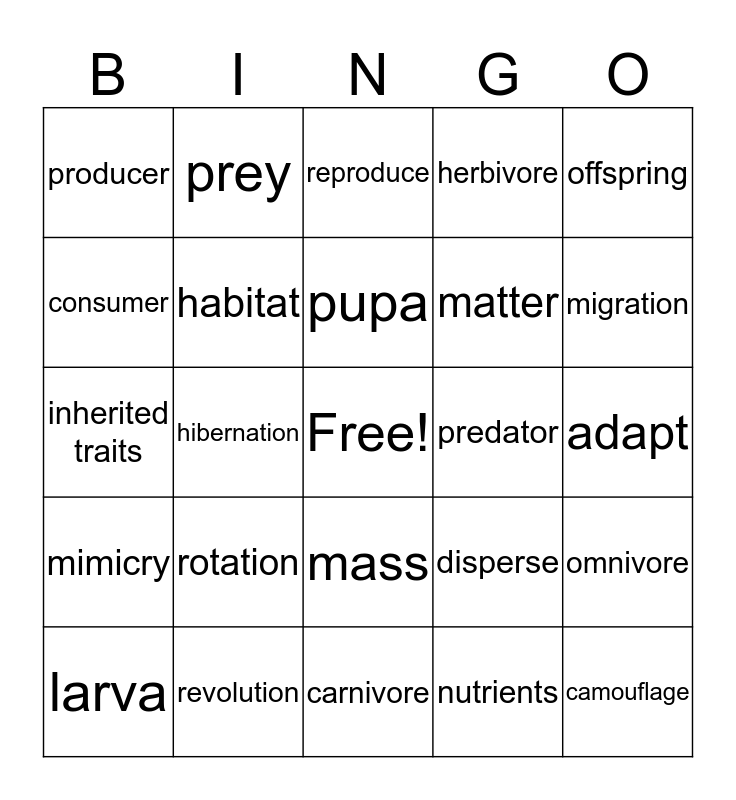 This bingo card has a free space and 24 words: rotation, revolution, pupa, larva, offspring, producer, consumer, prey, predator, mass, matter, inherited traits, disperse, omnivore, habitat, nutrients, adapt, reproduce, migration, hibernation, camouflage, mimicry, herbivore and carnivore.