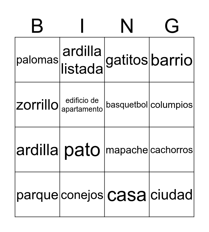 This bingo card has 16 words: conejos, cachorros, gatitos, palomas, ardilla, ardilla listada, mapache, casa, zorrillo, edificio de apartamento, parque, barrio, pato, columpios, basquetbol and ciudad.