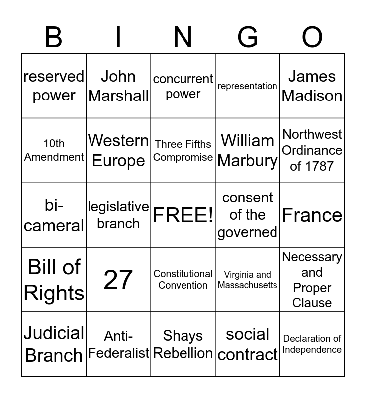 This bingo card has a free space and 31 words: Shays Rebellion, Third Parties, legislative branch, popular sovereignty, reserved power, concurrent power, Western Europe, Virginia and Massachusetts, consent of the governed, social contract, France, Declaration of Independence, federalism, Articles of Confederation, Northwest Ordinance of 1787, courthouses, Necessary and Proper Clause, 27, Bill of Rights, Constitutional Convention, James Madison, Articles, Judicial Branch, John Marshall, William Marbury, 10th Amendment, representation, bi-cameral, Anti-Federalist, Three Fifths Compromise and slavery.