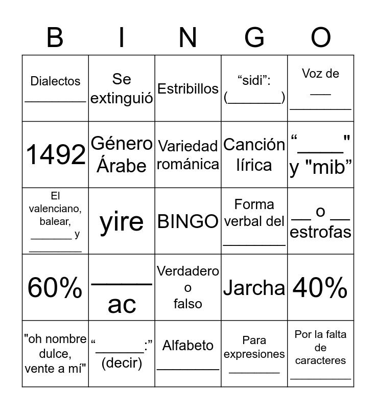 This bingo card has a free space and 24 words: ____ ac, “______:” (decir), Variedad románica, "oh nombre dulce, vente a mí", Voz de ___ _________, Dialectos _________, 1492, Se extinguió, Forma verbal del ________, Verdadero o falso, Canción lírica, El valenciano, balear, _______ y _________, Jarcha, 40%, Género Árabe, Para expresiones ________, __ o __ estrofas, Estribillos, “____" y "mib”, yire, Por la falta de caracteres __________, 60%, “sidi”:(_______) and Alfabeto ________.
