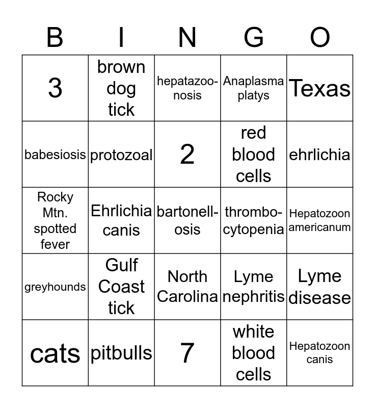 This bingo card has 25 words: Gulf Coast tick, 7, 2, cats, Texas, 3, babesiosis, brown dog tick, thrombo- cytopenia, North Carolina, red blood cells, Rocky Mtn. spotted fever, Lyme nephritis, Lyme disease, protozoal, Hepatozoon canis, Hepatozoon americanum, hepatazoo- nosis, ehrlichia, Ehrlichia canis, bartonell- osis, pitbulls, greyhounds, Anaplasma platys and white blood cells.