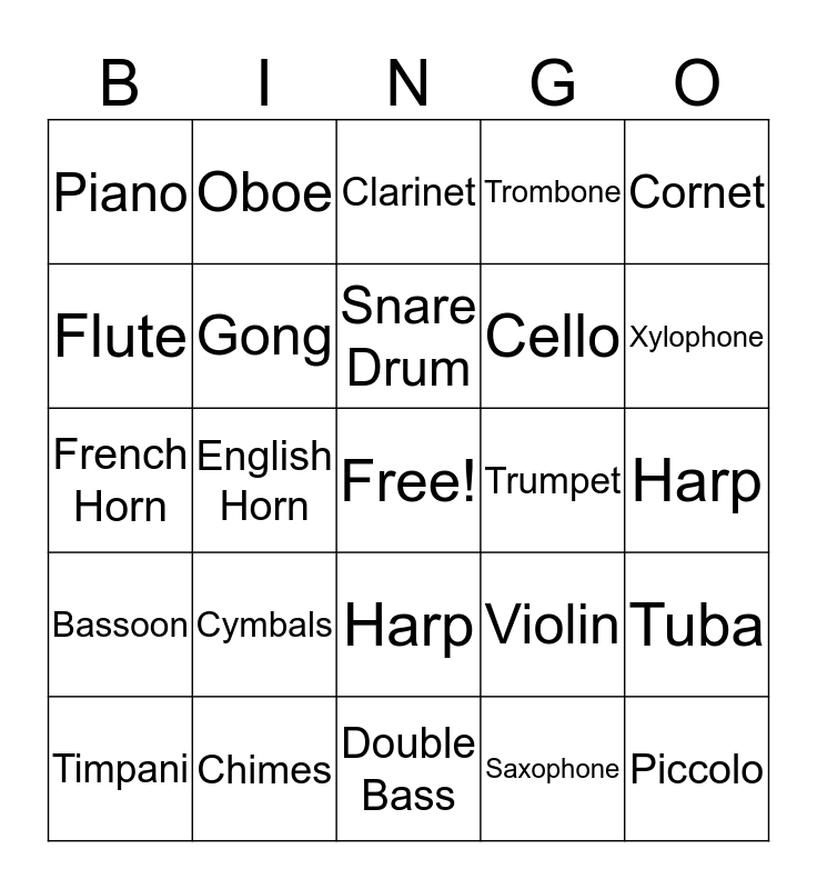 This bingo card has a free space and 27 words: Violin, Viola, Cello, Double Bass, Flute, Clarinet, Oboe, Bassoon, Trumpet, Tuba, French Horn, Trombone, Timpani, Chimes, Xylophone, Bass Drum, Gong, Snare Drum, Cymbals, Piano, Harp, Saxophone, English Horn, Piccolo, Harp, Cornet and Euphonium.