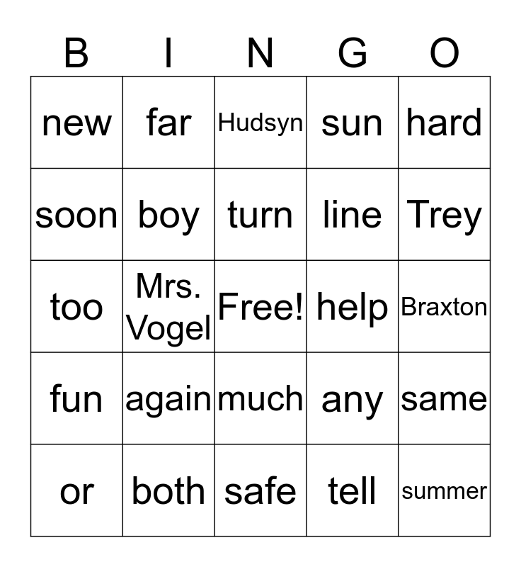 This bingo card has a free space and 24 words: again, both, turn, or, hard, new, soon, far, help, much, line, too, any, same, boy, tell, Braxton, Hudsyn, Trey, Mrs. Vogel, summer, fun, sun and safe.